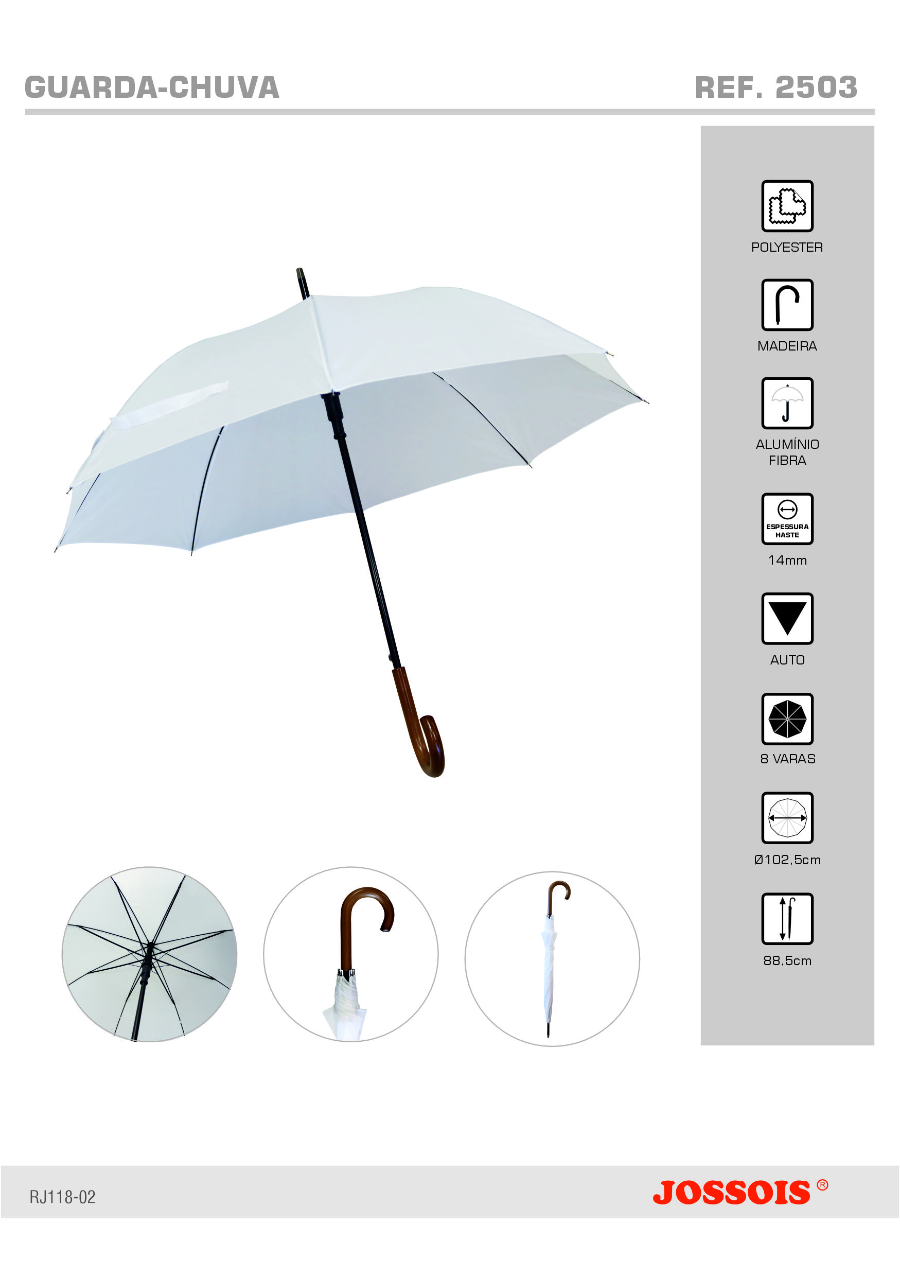 Guarda-chuva manual, haste em alumínio, varas em fibra e cabo curvo em madeiraTechnische Einzelheiten