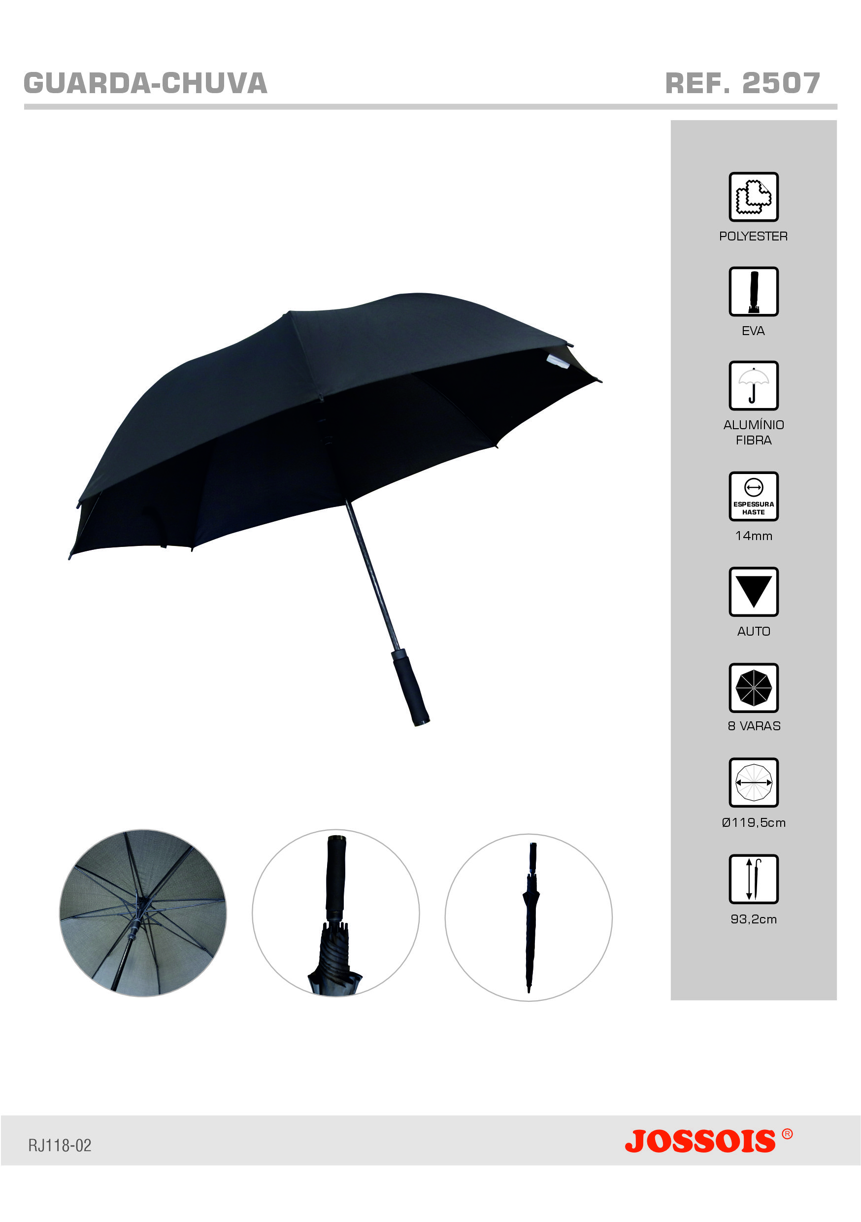Guarda-chuva manual, haste em alumínio, varas em fibra e cabo curvo em madeiraTechnische Einzelheiten