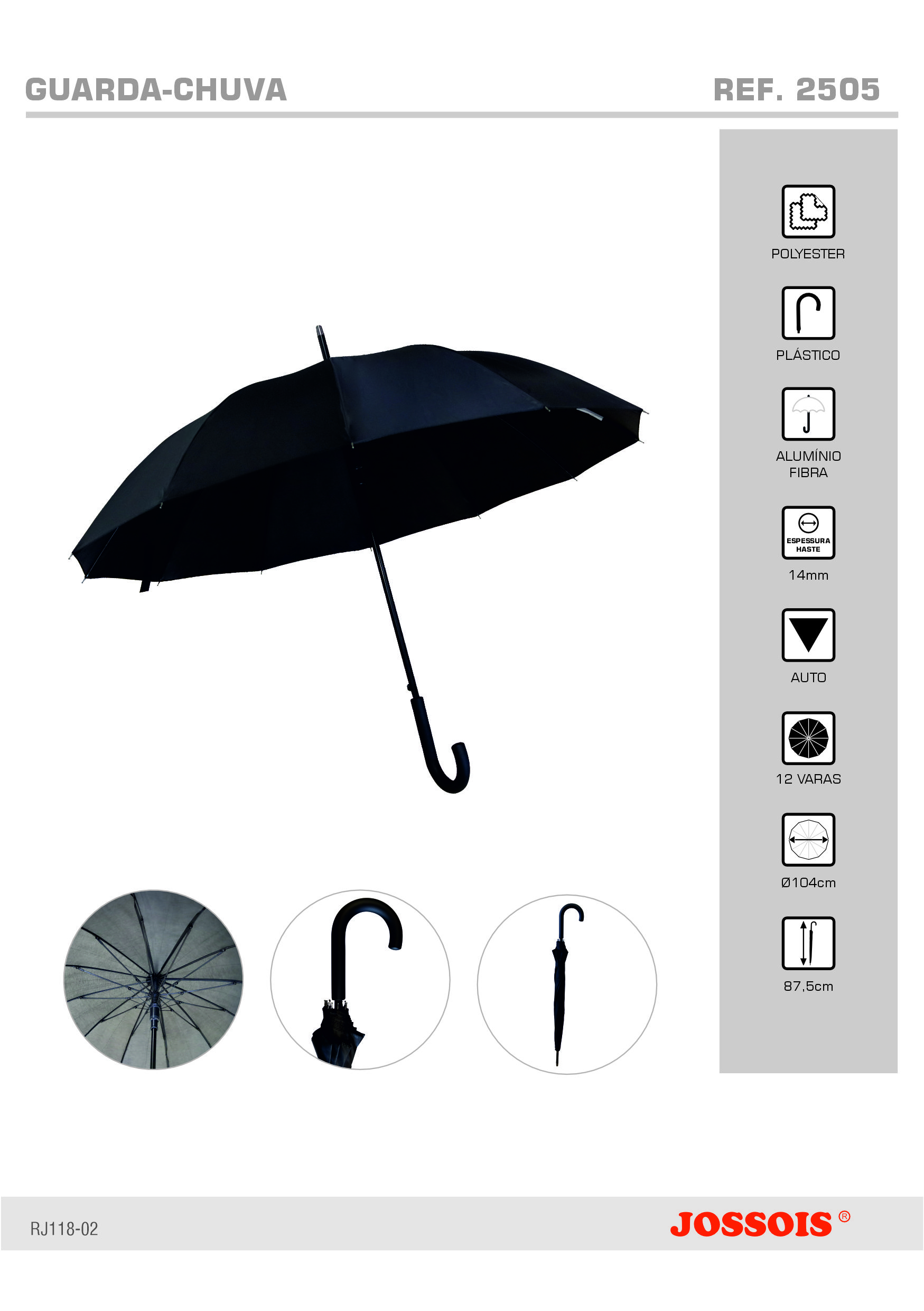 Guarda-chuva manual, haste em alumínio, varas em fibra e cabo curvo em madeiraTechnical details